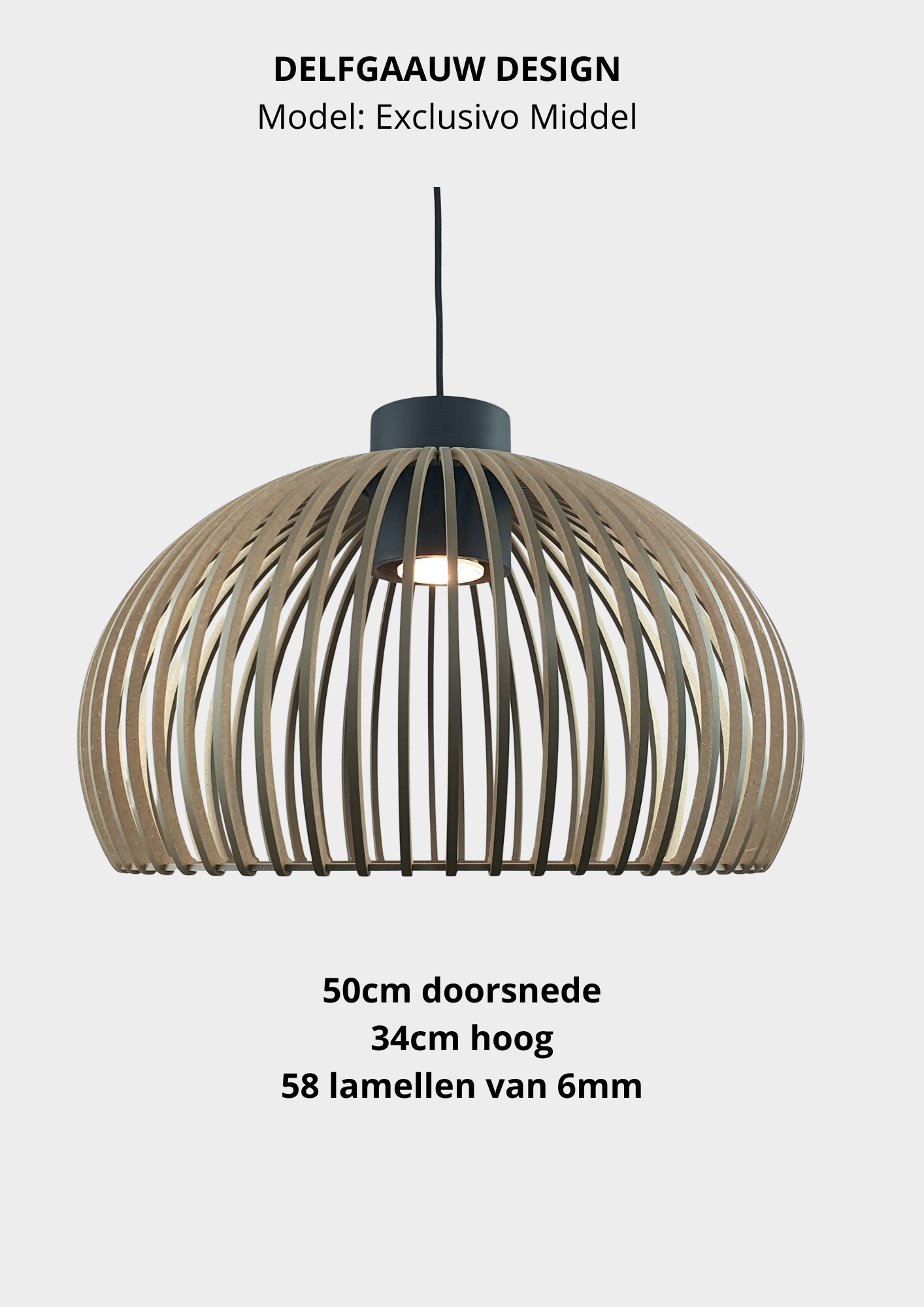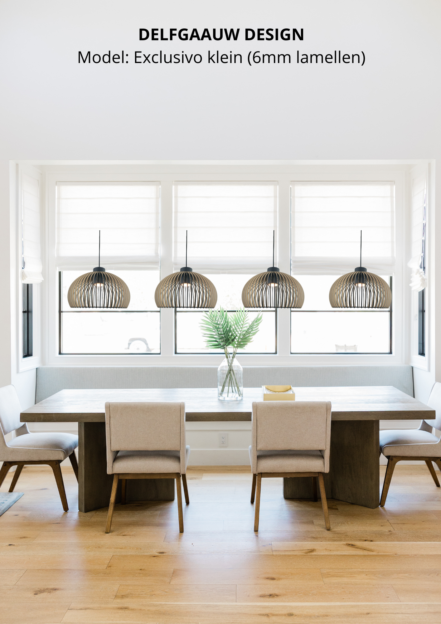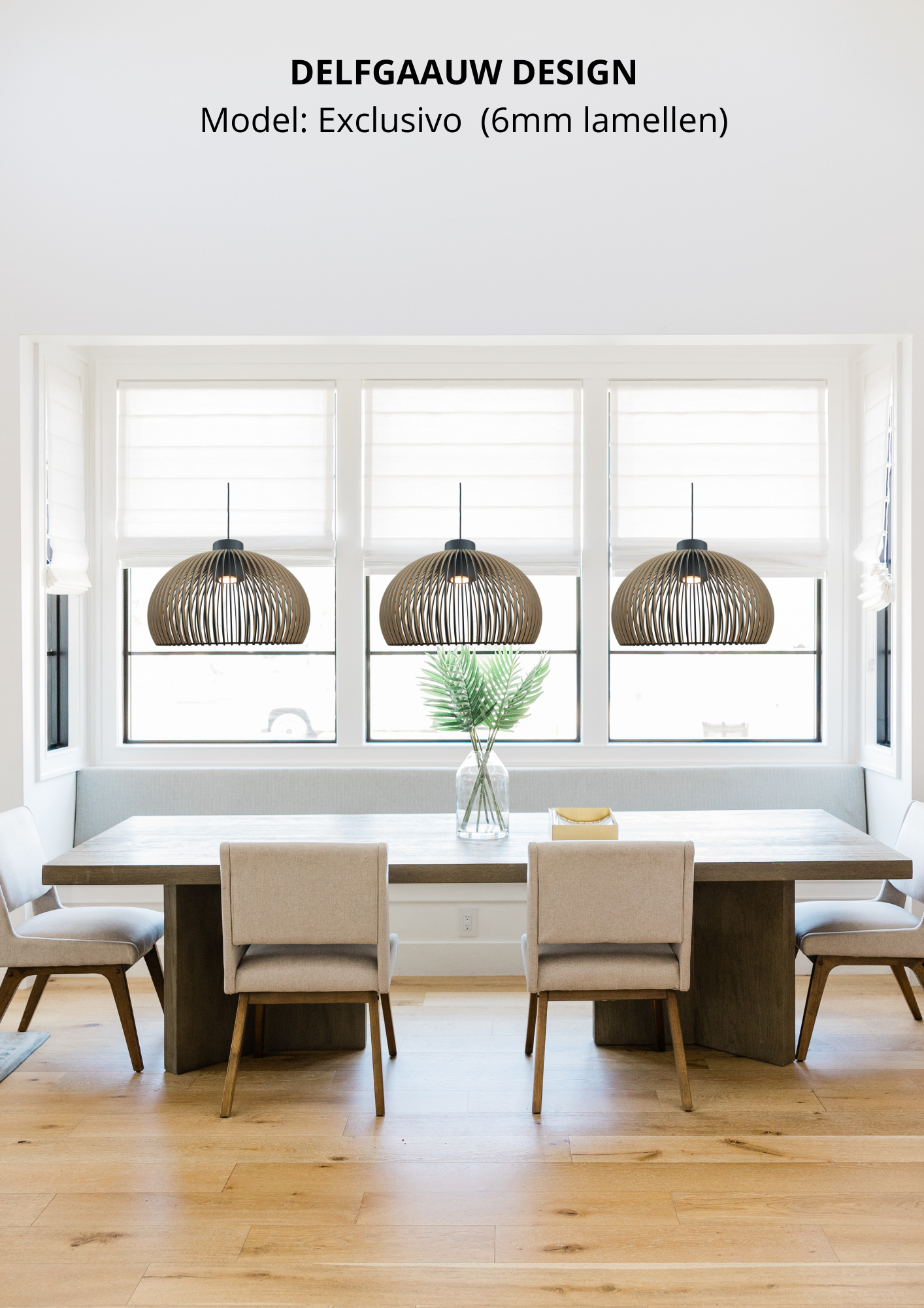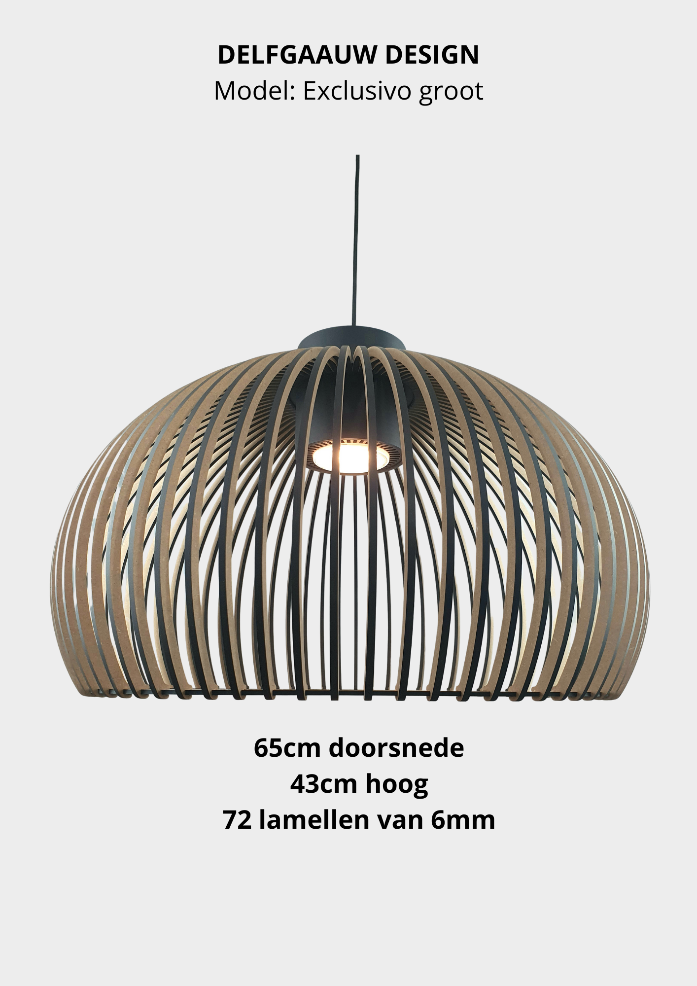 Naast de standaard versie is de Exclusivo ook beschikbaar in de Lujo uitvoering. Deze luxe versie onderscheidt zich door de dunner gesneden lamellen van 4 mm, wat een verfijnde uitstraling geeft en de esthetiek van de lamp naar een hoger niveau tilt.