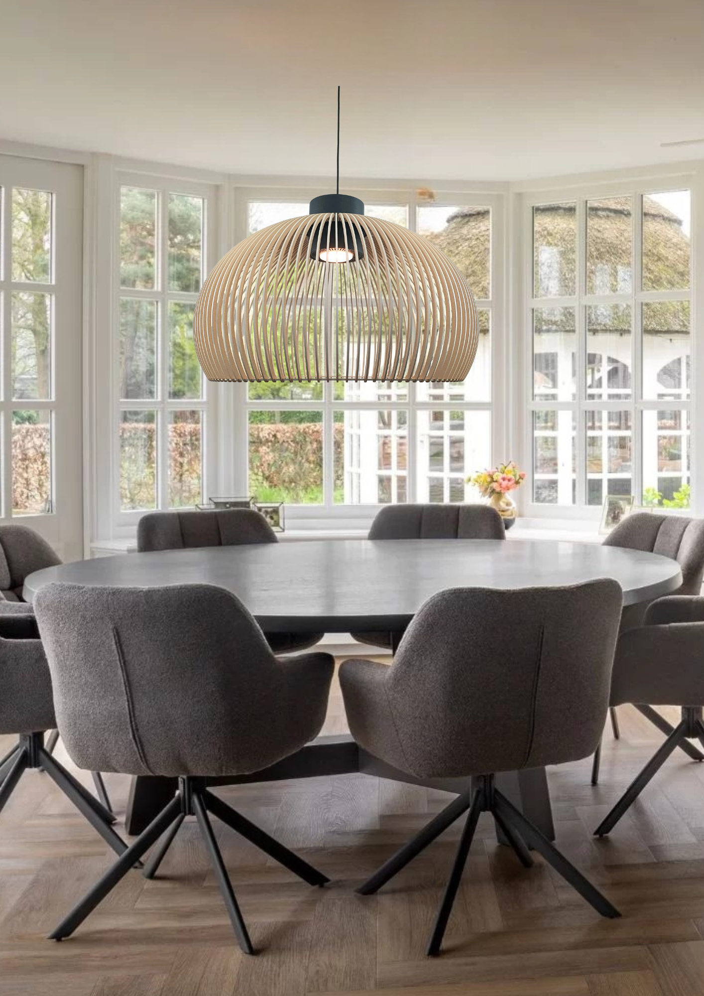 Gemaakt met 112 lamellen van 4 mm, straalt de lamp zowel vakmanschap als modern design uit.