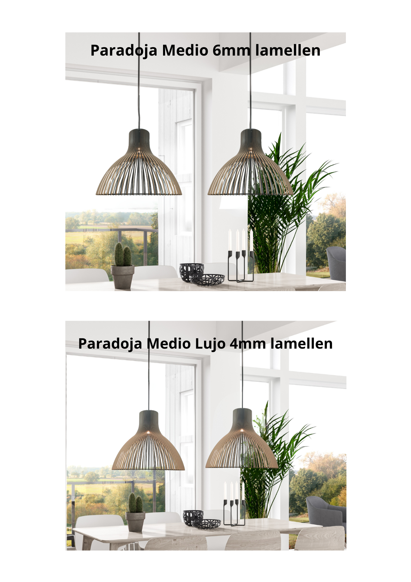 De Paradoja medio is volledig met de hand geproduceerd in onze Nederlandse werkplaats. We gebruiken hiervoor, 4mm dik MDF 90 lamellen wat niet alleen duurzaam is, maar ook een unieke uitstraling heeft die past bij elk interieur. Dankzij de zorgvuldige productie heeft deze lamp een warme en gezellige uitstraling, waardoor hij perfect past in elke kamer in huis.
